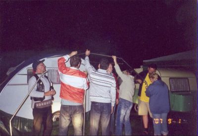Dürfen wir vorstellen "Egg-Bärt", Anja´s Dübener Ei und wie Ihr seht benötigt man zum Aufbau des Vorzeltes 7!!!!! Personen.